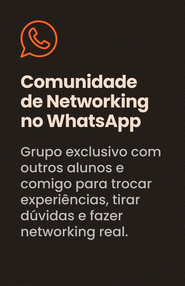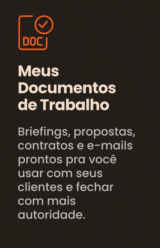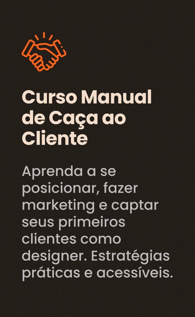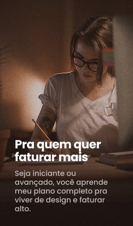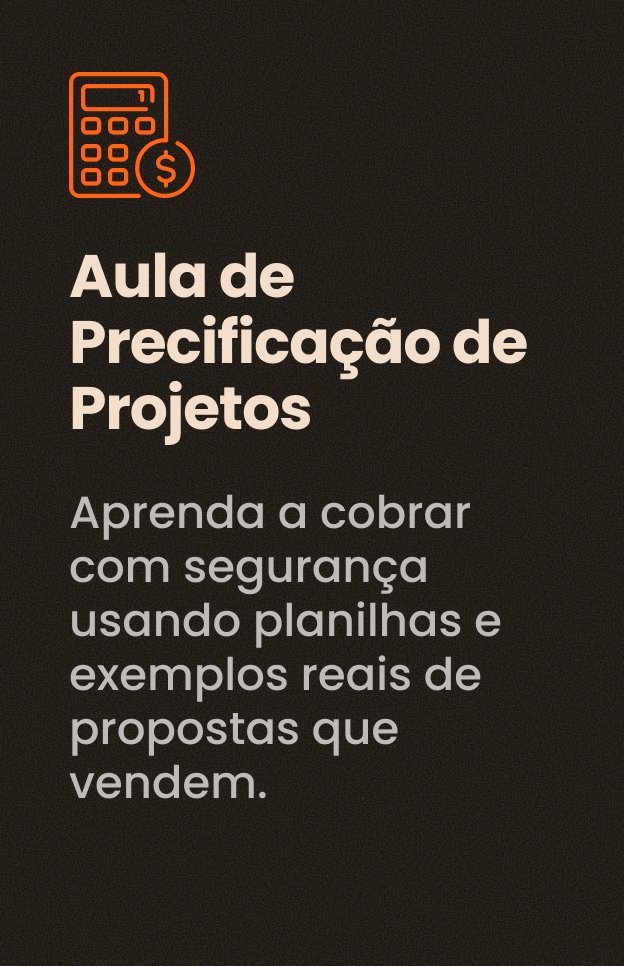 Aqui você aprende a transformar habilidade em renda. Posicionamento, precificação, negociação, propostas que encantam, captação de clientes e construção de autoridade. E, claro, o plano que eu uso para faturar R$20 mil/mês com design.